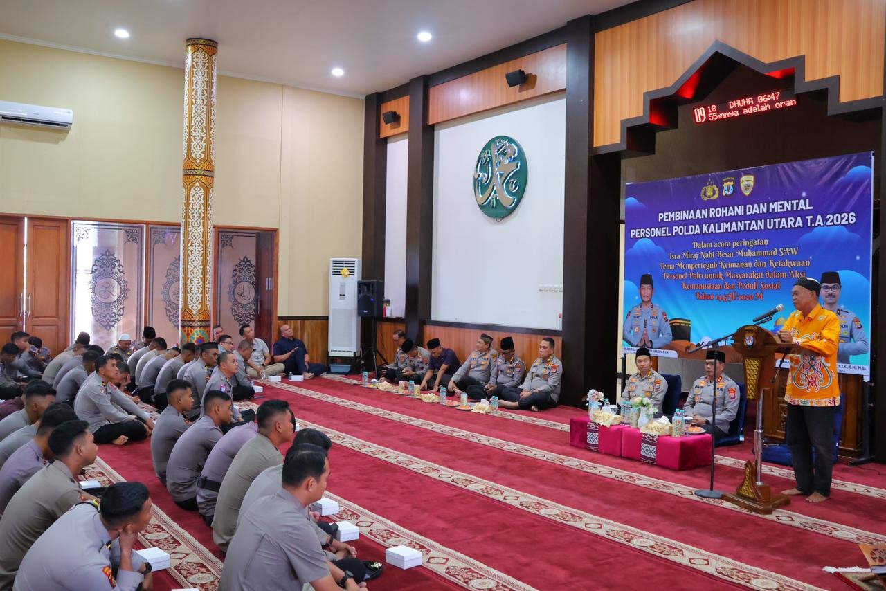 TANJUNG SELOR – Kepolisian Daerah Kalimantan Utara (Polda Kaltara) melaksanakan peringatan Isra Mi’raj Nabi Muhammad SAW di Masjid Nur Aryyaguna Polda Kaltara dengan tema “Memperteguh Keimanan dan Ketakwaan Personel Polri untuk Masyarakat dalam Aksi Kemanusiaan dan Peduli Sosial Tahun 2026.” Kamis (22/01/2026)