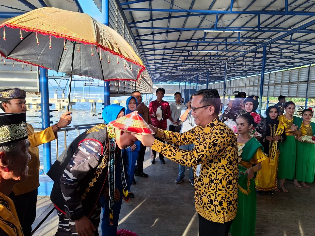 Begitu turun dari speedboat, tarian khas dari Sanggar Busak Malay langsung menyapa rombongan Danlanal. Sebagai simbol penerimaan warga perbatasan, Pj Sekda Raden Iwan mengalungkan selempang manik bermotif ukiran Lulantatibu serta mengenakan saung basung—kerajinan tradisional Dayak Lundayeh asal Krayan—kepada Kolonel Slamet Ariyadi dan istri.