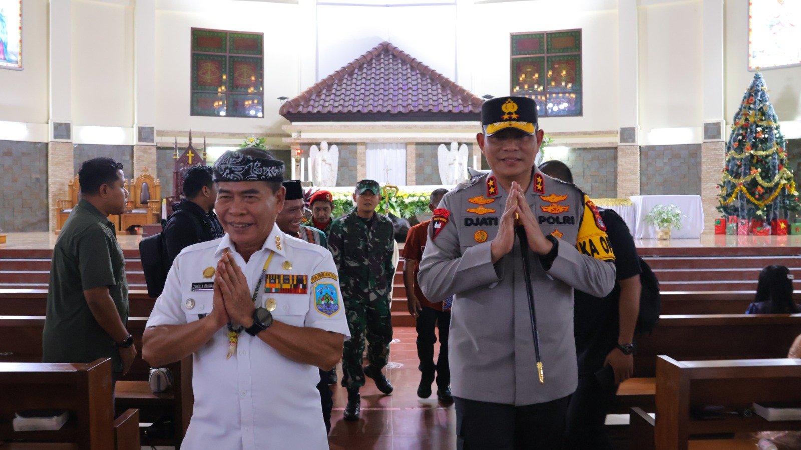 TANJUNG SELOR – Kapolda Kalimantan Utara Irjen Pol. Djati Wiyoto Abadhy, S.I.K., bersama Gubernur Kaltara Drs. Zainal A. Paliwang, S.H., M.Hum., melakukan peninjauan langsung ke sejumlah gereja di Tanjung Selor pada malam perayaan Natal, Rabu (24/12/2025).