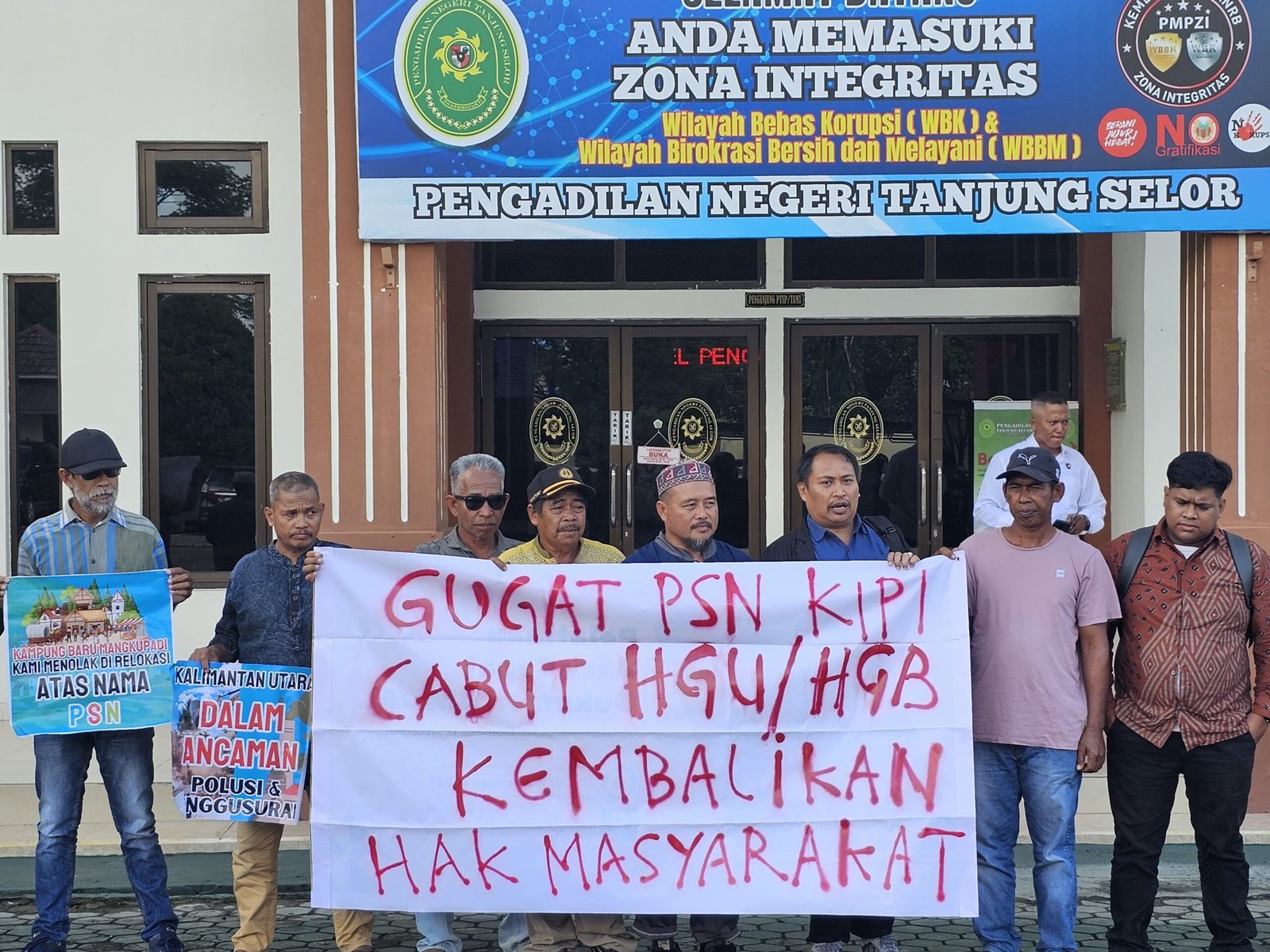 TANJUNG SELOR – Belasan penduduk dari Kampung Baru mendatangi kantor Pengadilan Negeri kelas 1b Tanjung Selor guna mengajukan tuntutan hukum secara resmi terkait Pembangunan Proyek Strategis Nasional (PSN) Kawasan Industri Hijau Indonesia (KIHI). Mereka merasa keberadaan kawasan industri tersebut telah merampas ruang hidup serta menghancurkan mata pencaharian utama sebagai nelayan tradisional setempat.